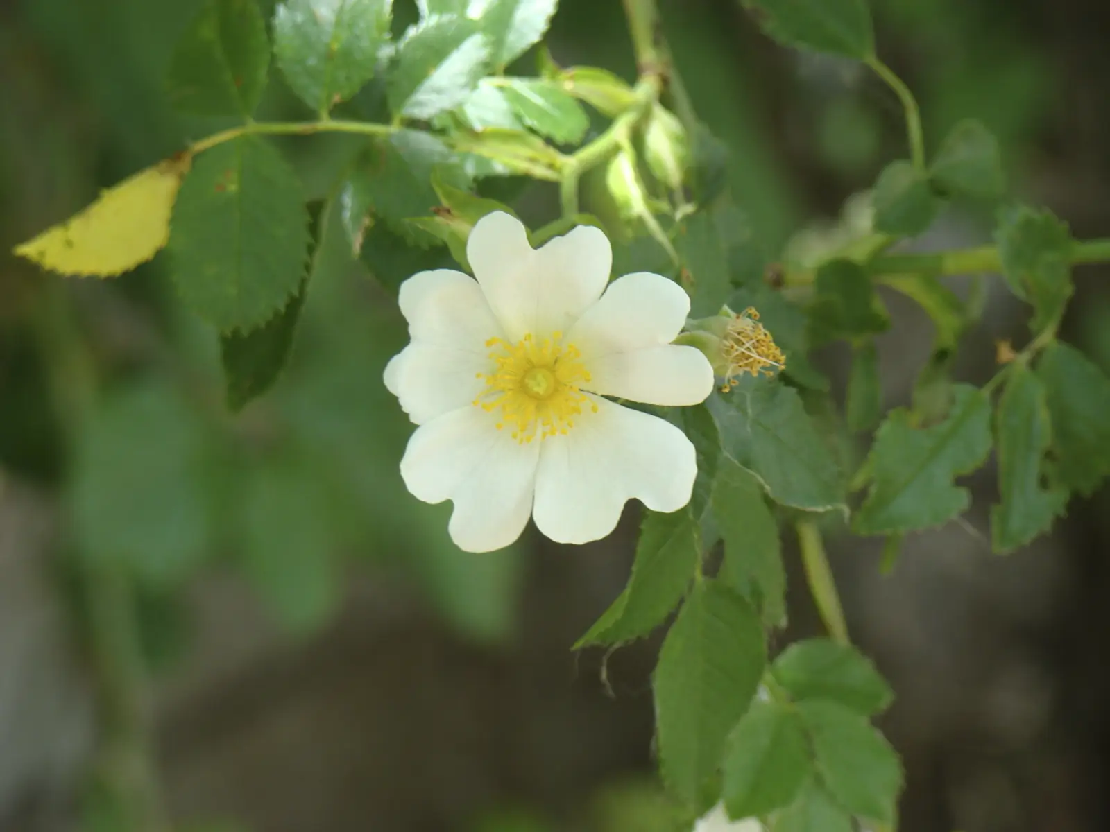 Arbusto caducifolio espinoso. Hojas compuestas pinnadas con foliolos ovales de bordes serrados. Flores solitarias blancas o rosadas con cinco pétalos desiguales y numerosos estambres. El fruto, llamado escaramujo, tiene forma ovoide y es de color rojo, contiene abundantes huesecillos cubiertos de pelos.
