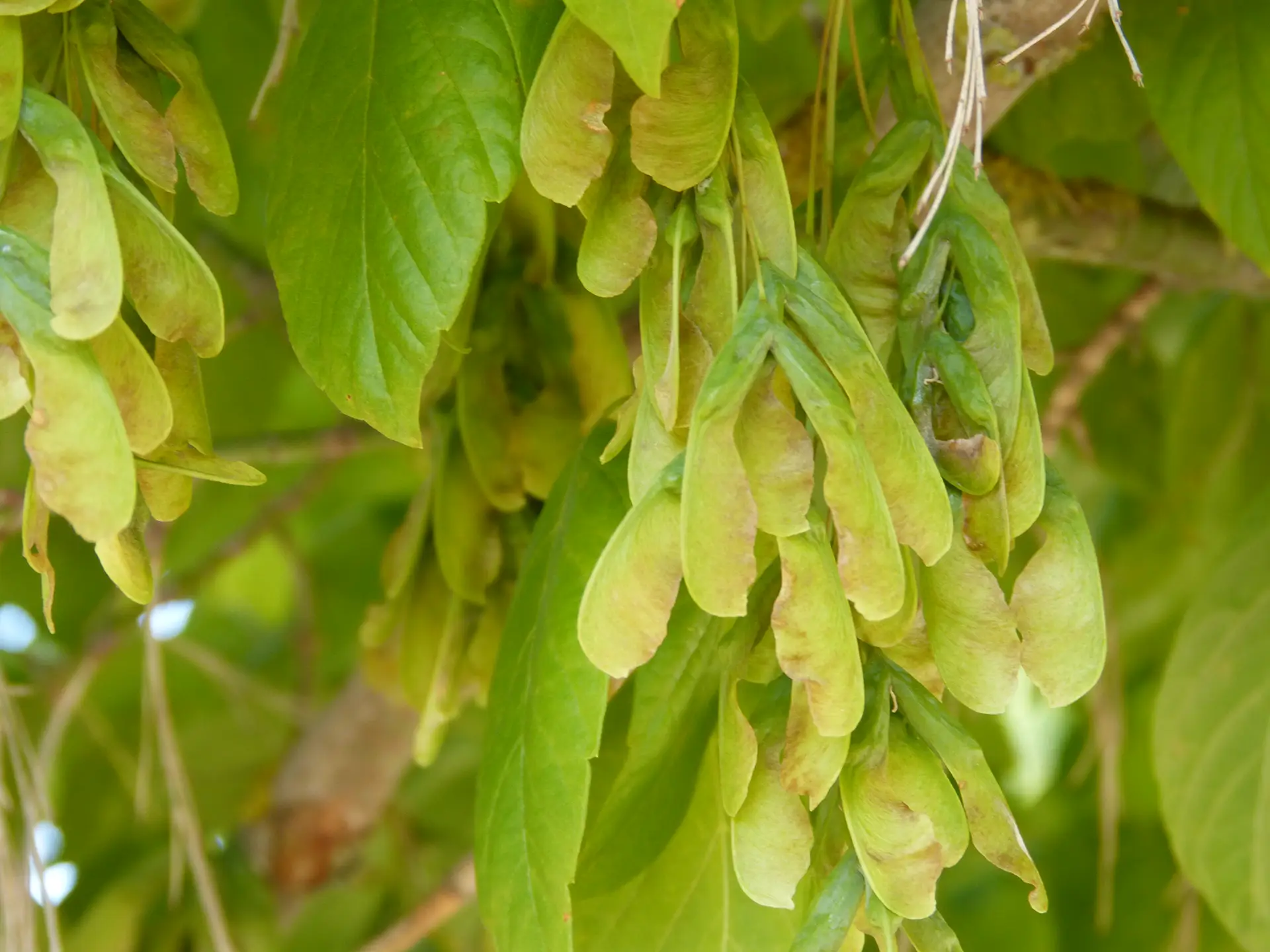 Árbol caducifolio con hojas opuestas, simples, palmatilobadas, de 5 lóbulos bien marcados, parecidas a las del plátano de sombra. Verde brillante, amarillean intensamente en otoño. Flores pequeñas, de color amarillo verdoso, agrupadas en corimbos antes de que broten las hojas. Frutos en sámaras dobles, con alas extendidas casi en línea recta.