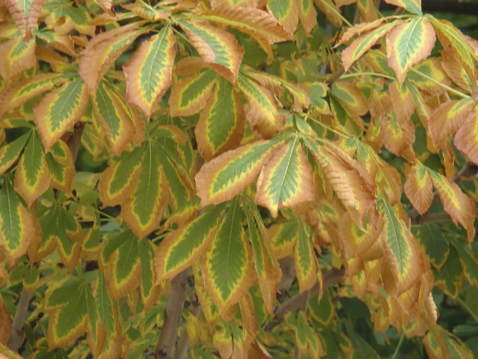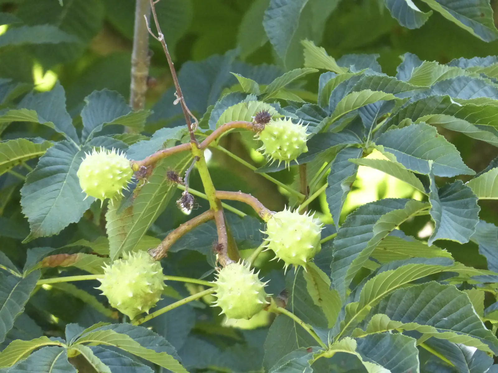 Árbol caducifolio con hojas opuestas, palmaticompuestas, con 5 a 7 folíolos grandes obovados, dentados, dispuestos como los radios de una rueda. Flores blancas con manchas rosadas o amarillas, agrupadas en panículas grandes y vistosas en primavera. Frutos tipo cápsula espinosa que contienen una o dos semillas grandes, brillantes y marrones (las castañas de Indias).