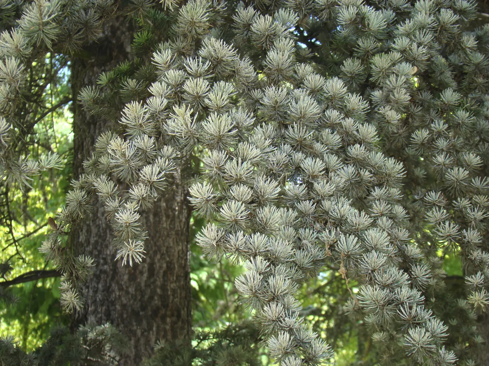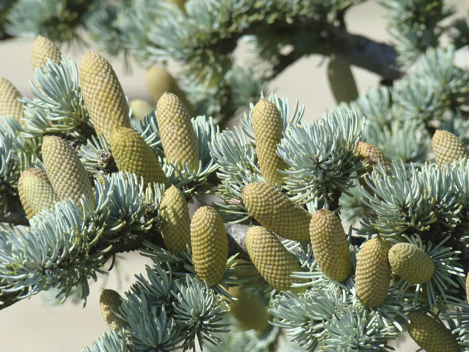 Árbol perennifolio con acículas rígidas, de 2–3 cm, agrupadas en fascículos densos. Color azul plateado intenso. Flores reunidas en conos, los masculinos erguidos, cilíndricos; los femeninos más gruesos, se desarrollan lentamente. Frutos de tipo piñas erectas de hasta 10 cm, que se desintegran al llegar a la madurez para liberar semillas aladas.