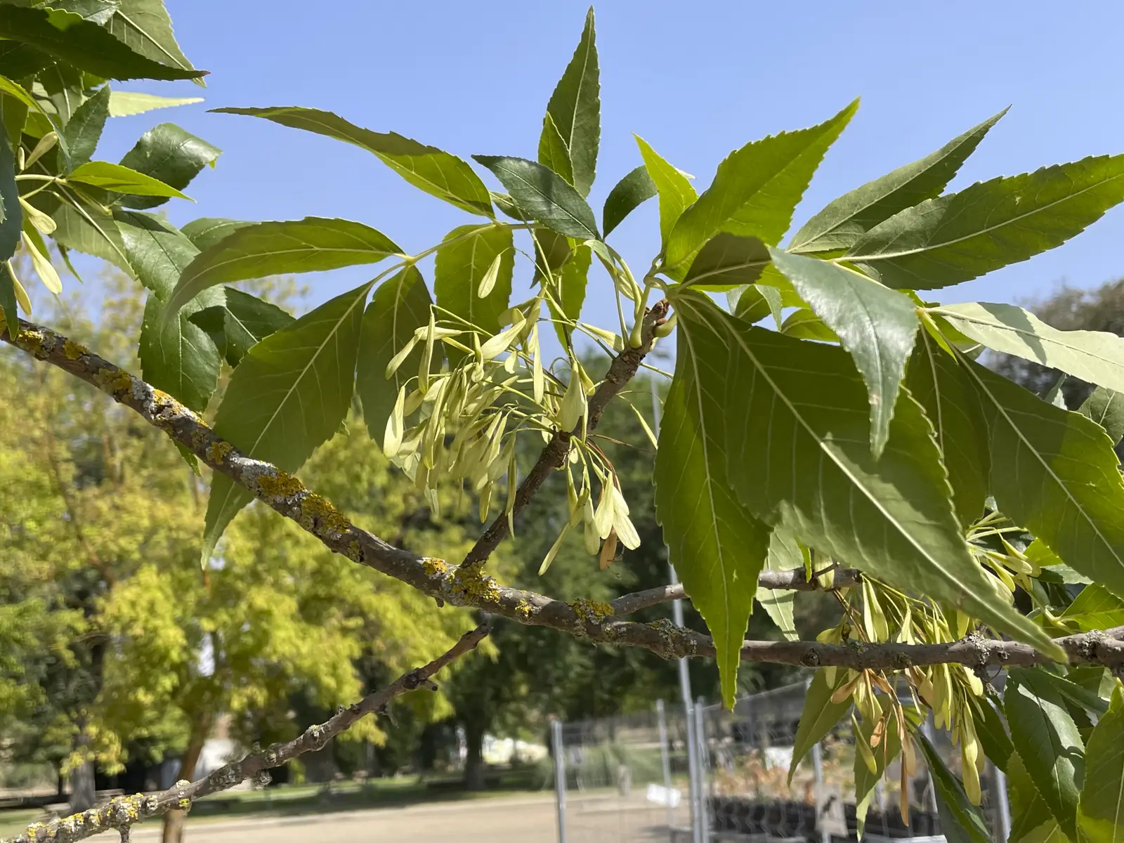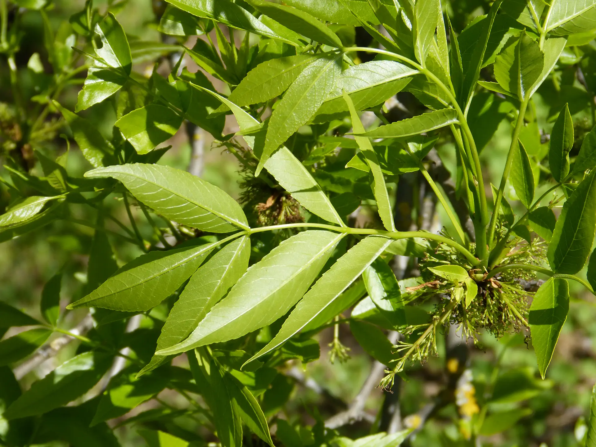 Árbol caducifolio . Yemas con tomento rojo. Hojas compuestas con 7-9 foliolos oblongo lanceolados estrechados en el ápice, con el margen ligeramente aserrado. Haz de color verde amarillento. Flores apétalas, las masculinas y las femeninas en pies distintos, aparecen antes que las hojas. Los frutos, sámaras, son estrechos con el ápice redondeado.