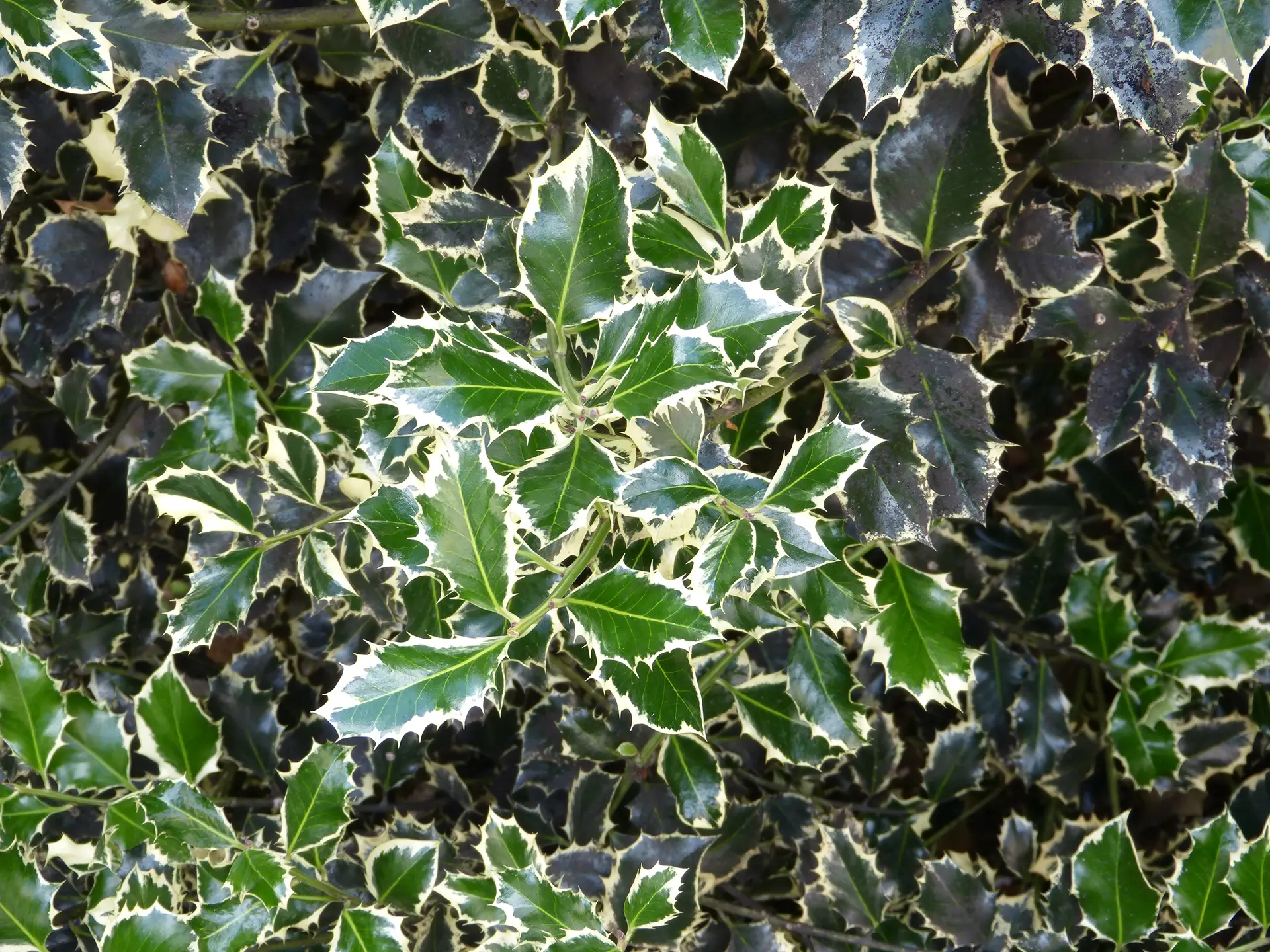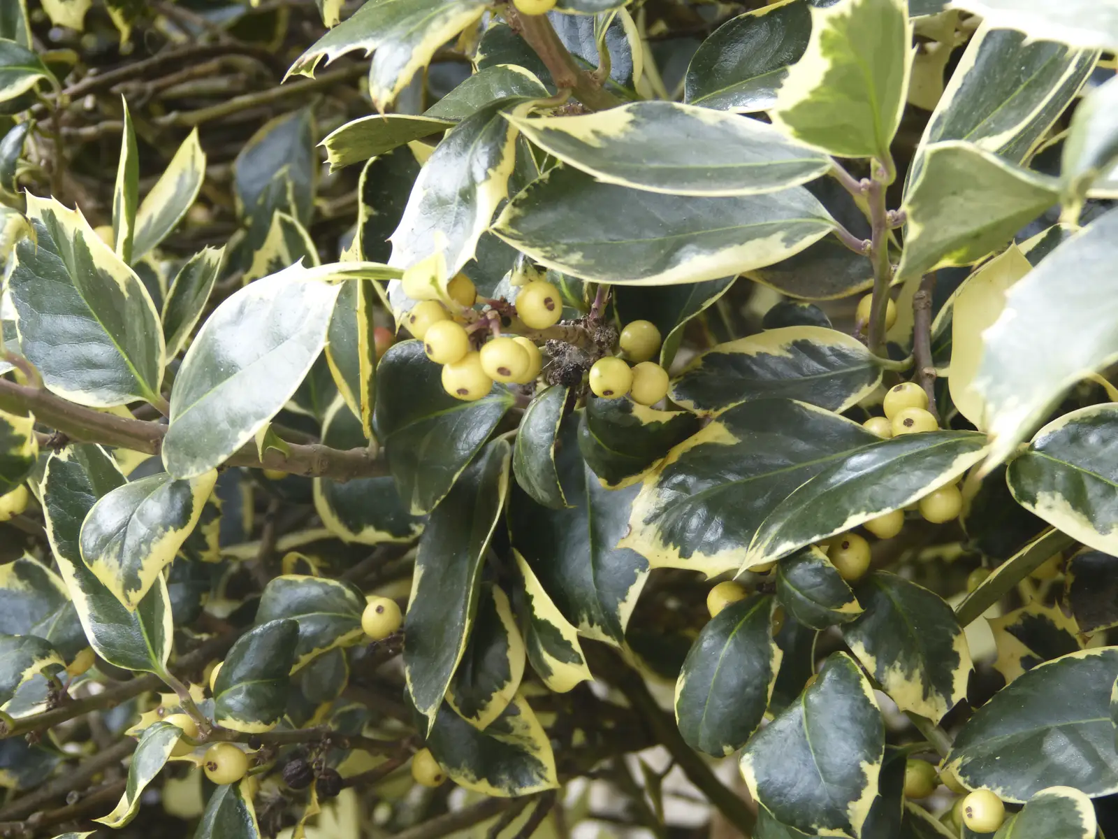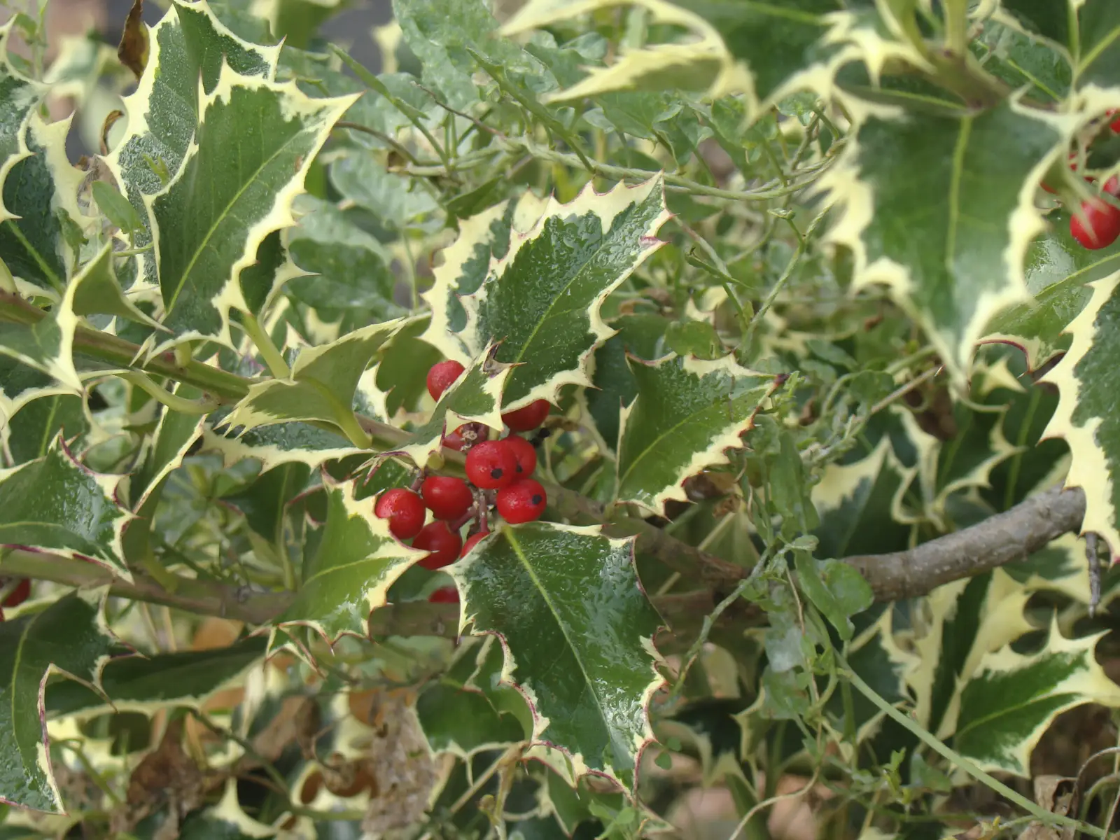 Arbusto o arbolito perennifolio, de hojas simples, alternas, rígidas y coriáceas, con bordes espinosos muy marcados y color verde brillante. La variedad “Madame Briot” tiene hojas algo más grandes y de color verde claro con el borde amarillento. Flores pequeñas, blancas y poco vistosas con olor suave. Frutos formando bayas globosas, rojas brillantes, que maduran en invierno y, además de alimento para las aves, son muy decorativas.