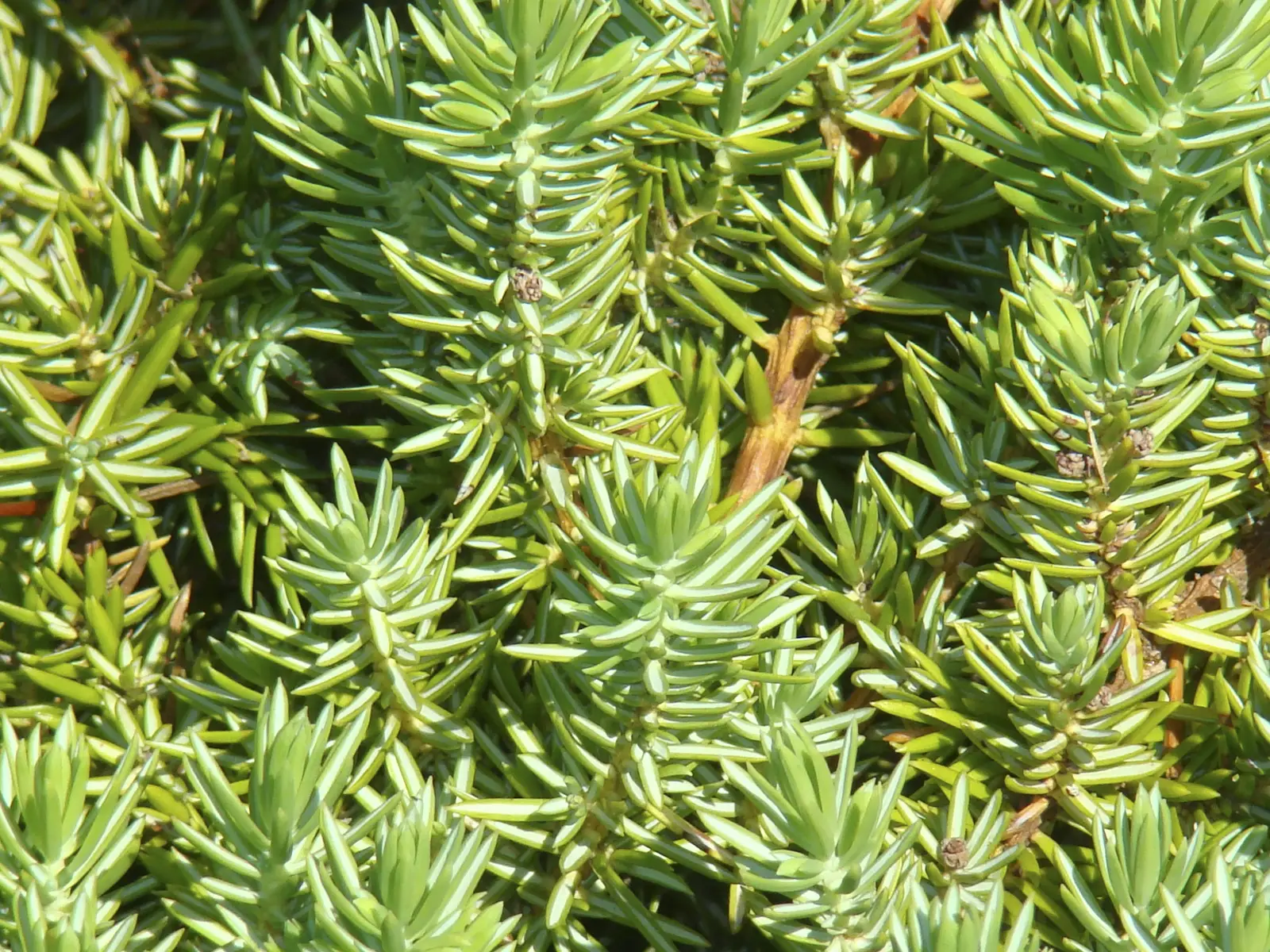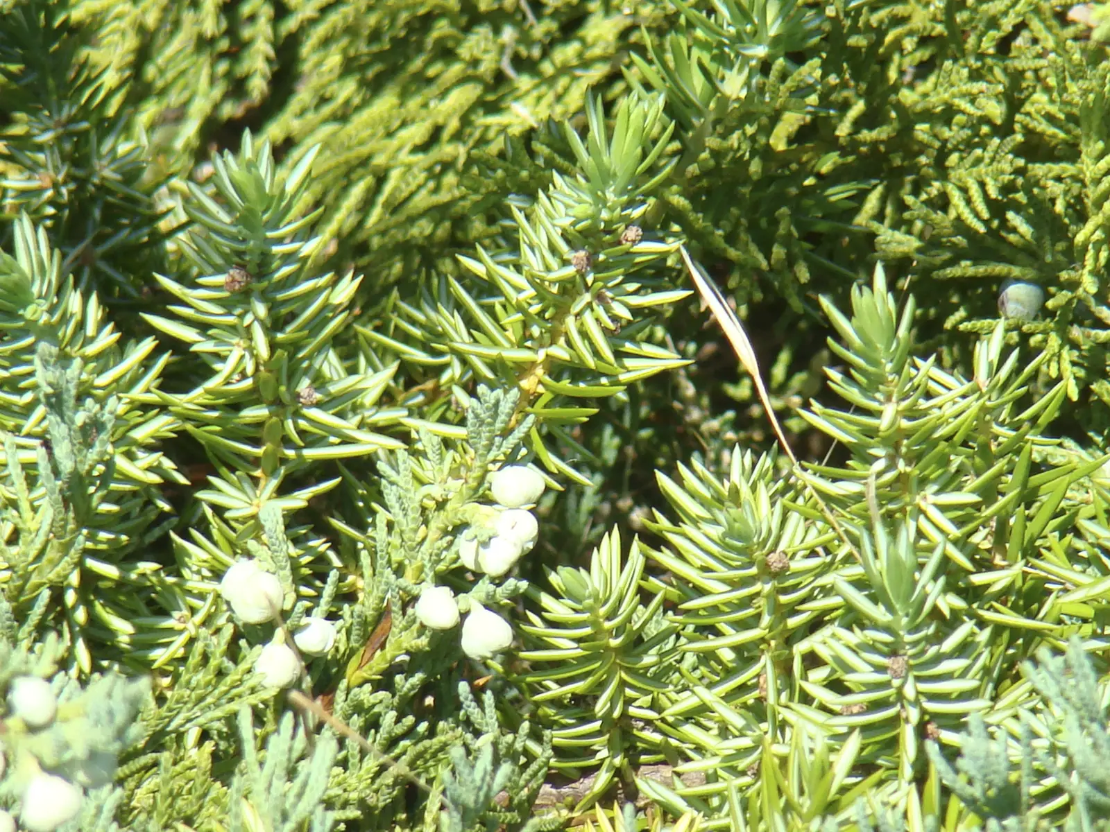 Arbusto perennifolio de acículas cortas, rígidas, de unos 5 mm, densas y dispuestas en verticilos, verde grisáceo a azul verdoso, con una banda estomática blanca en el haz, textura áspera. Flores reunidas en conos masculinos amarillentos y los femeninos verdes, flores poco vistosas. Semillas reunidas en arcéstidas (conos) globosas azuladas con recubrimiento ceroso, que tardan unos dos años en madurar; contienen una o dos semillas.