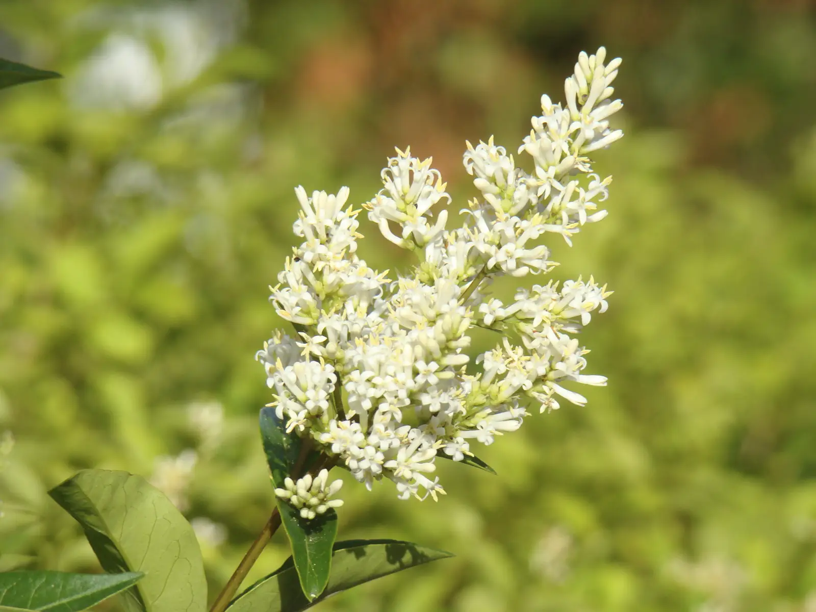 Arbusto perennifolio, de hojas simples, opuestas, ovaladas a elípticas, de 4 a 8 cm, verde oscuro, textura lisa y semibrillante, margen entero. Flores en panículas terminales de pequeñas flores blancas muy perfumadas, con cinco pétalos, que florecen en verano. Fruto tipo baya de color negro, pequeñas, que maduran en otoño, consumidas por aves.