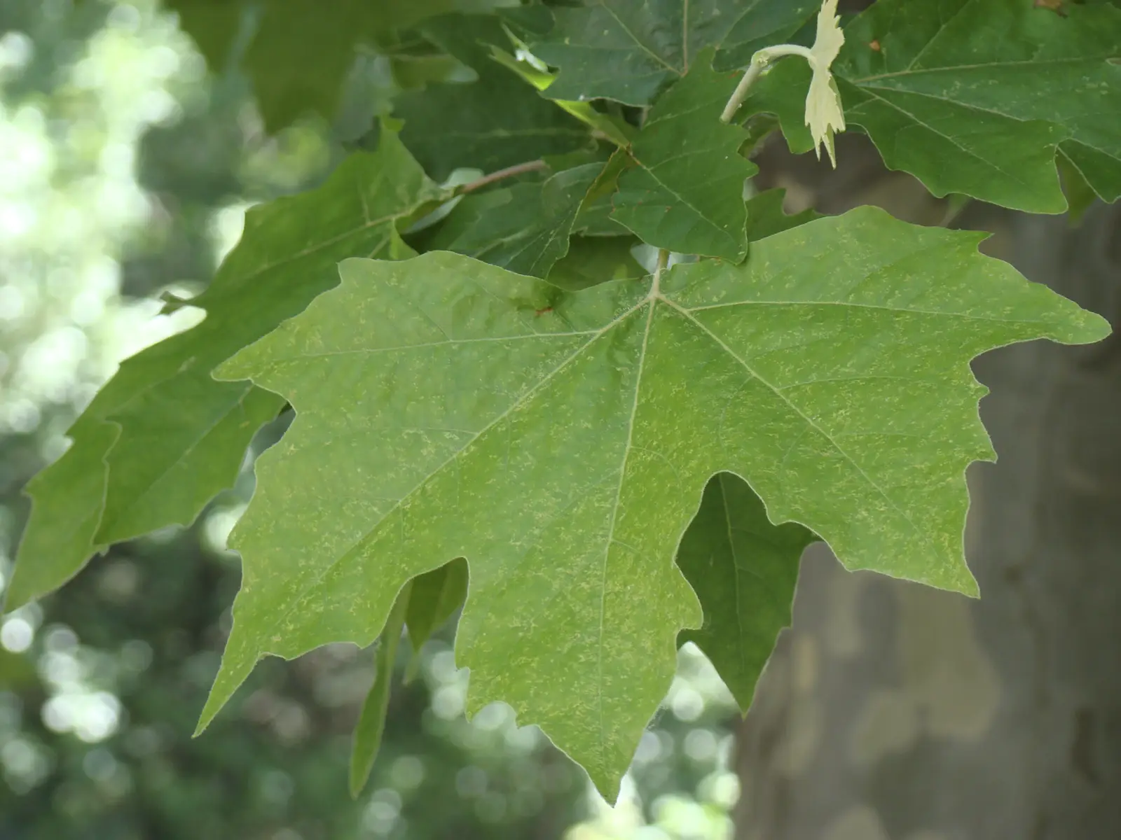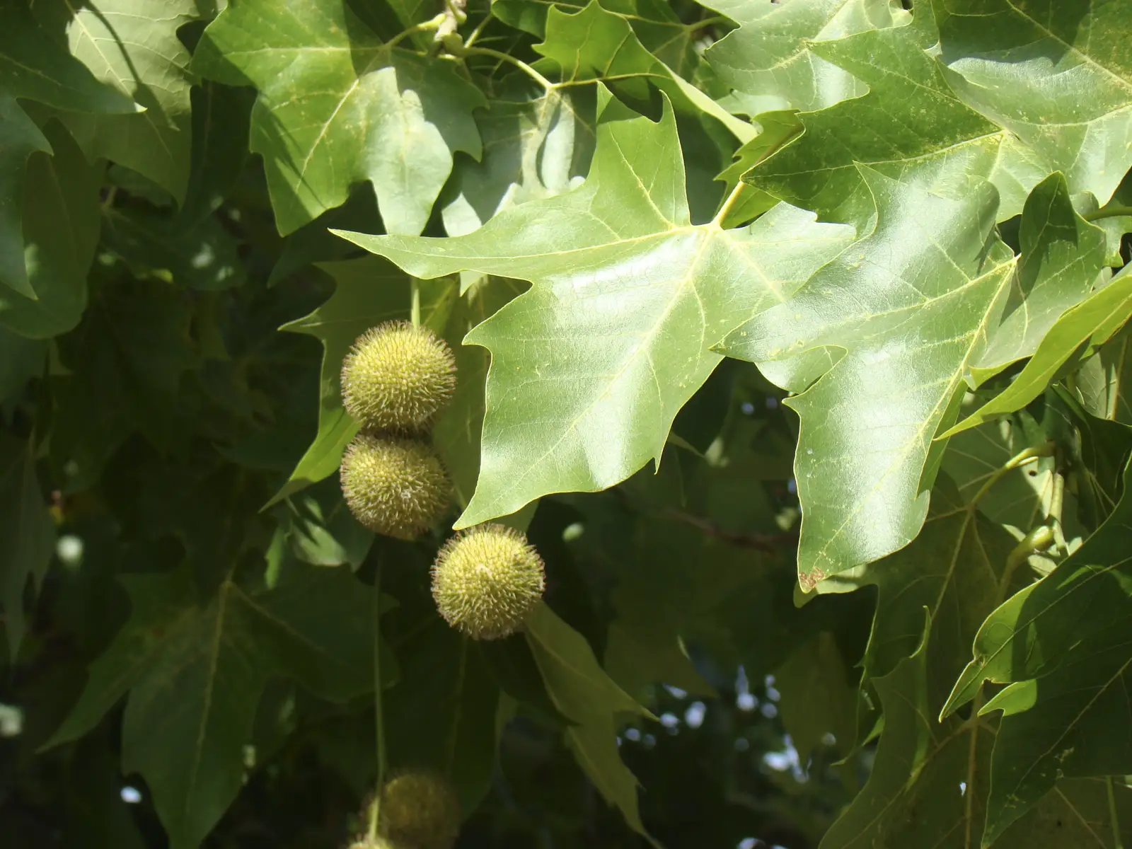 Árbol caducifolio de gran tamaño con tronco reconocible por su corteza grisácea que se desprende en grandes placas. Hojas alternas, palmeadas con lóbulos triangulares, que recuerdan a las de los arces. Cuando son jóvenes están cubiertas por una pelusa blanquecina. Los nervios suelen encontrarse en la base de la hoja. Los frutos son redondeados de color verde que se tornan pardos cuando maduran. Se mantienen colgando del árbol durante una parte del invierno.