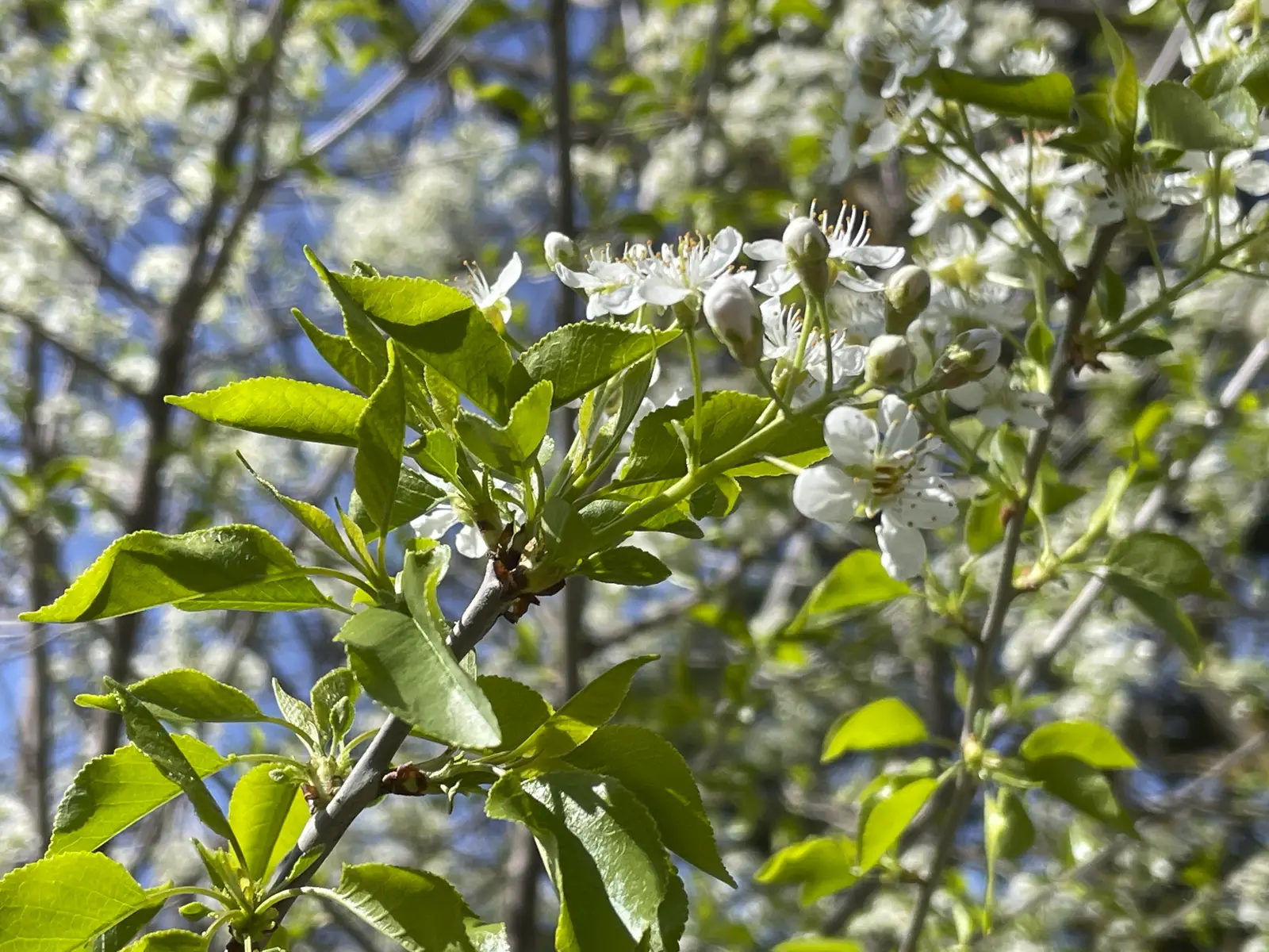 Arbolito caducifolio de madera olorosa, con hojas pequeñas de bordes dentados y forma entre ovada y acorazonada. Florece al tiempo que echa las hojas. Las flores son pequeñas, olorosas, con cinco pétalos blancos. El fruto es una drupa ovoide del tamaño de un guisante con color verde inicial y negro cuando madura. Los frutos son poco carnosos y de sabor amargo y áspero.