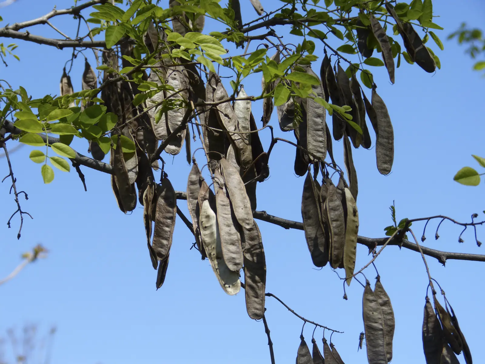 Árbol caducifolio con la corteza profundamente estriada. Hojas compuestas pinnadas con 11-15 foliolos de unos 3 cm. Flores aromáticas y melíferas que aparecen dispuestas en racimos péndulos de color blanco. Frutos: legumbres alargadas de color pardo rojizo a pardo oscuro que se abren en dos valvas al madurar.
