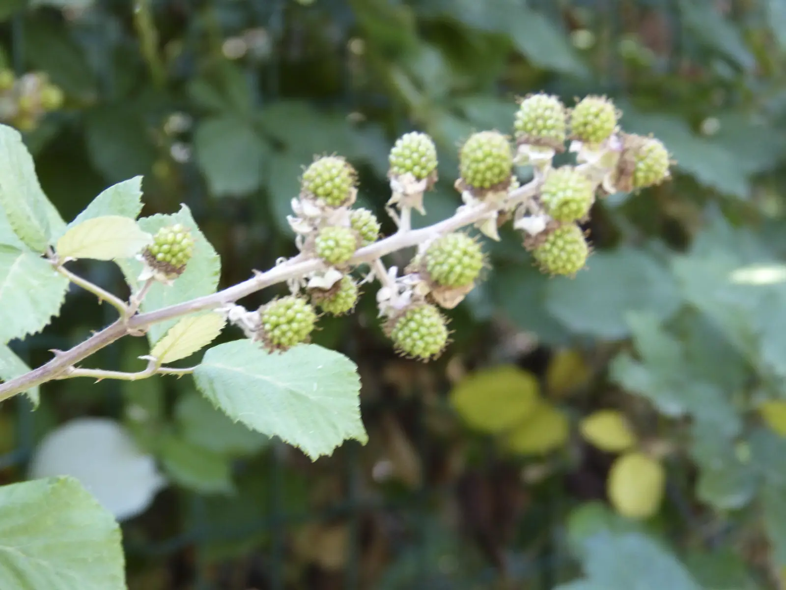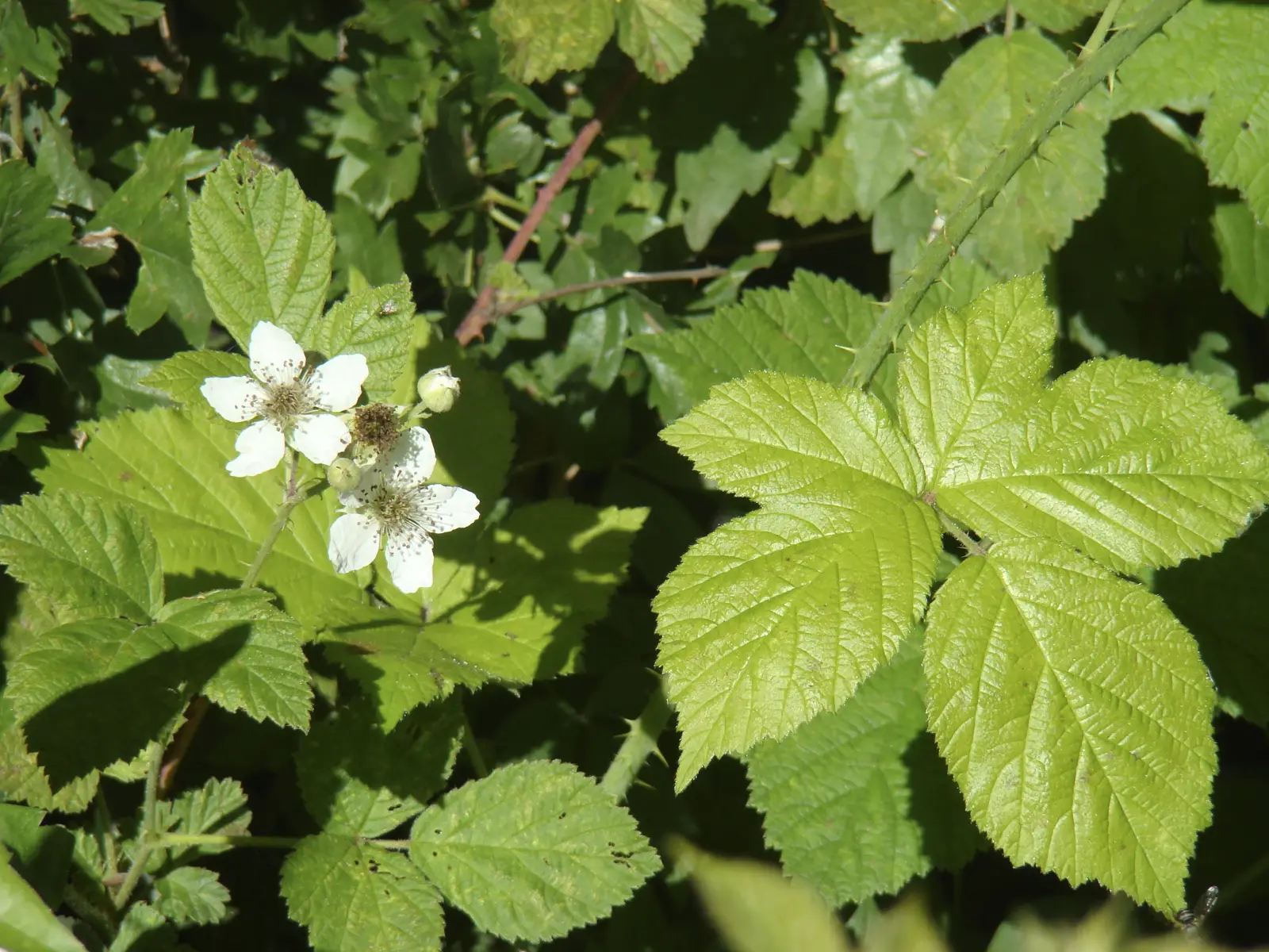 Arbusto impenetrable, que crece más a lo ancho que a lo alto, con espinas ganchudas en las ramas. Hojas, que recuerdan a las del olmo, compuestas de 3 a 5 foliolos con el margen. Flores blancas o sonrosadas con cinco pétalos y numerosos estambres. Frutos rojos al principio y negros al madurar, formado por pequeñas drupas agrupadas en una cabezuela globosa: la mora.