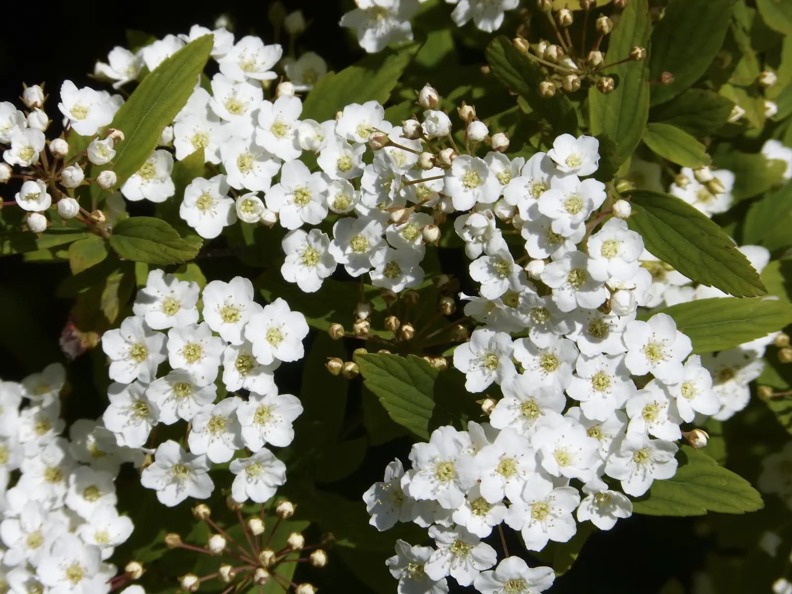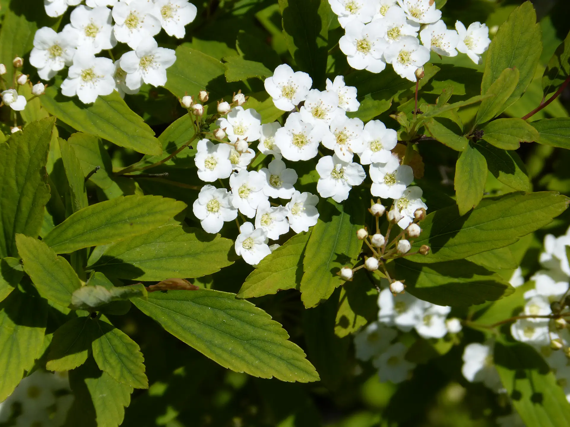 Es un arbusto caducifolio de unos 2 m de altura con ramas delgadas y arqueadas. Las hojas son alternas, lanceoladas, elíptico-romboidales u obovadas y de color verde azulado. Las flores blancas, dispuestas en corimbos, son tan abundantes que inclinan las ramas. El fruto es un polifolículo, con 3-5 folículos membranáceos no dilatados y pluriseminados.