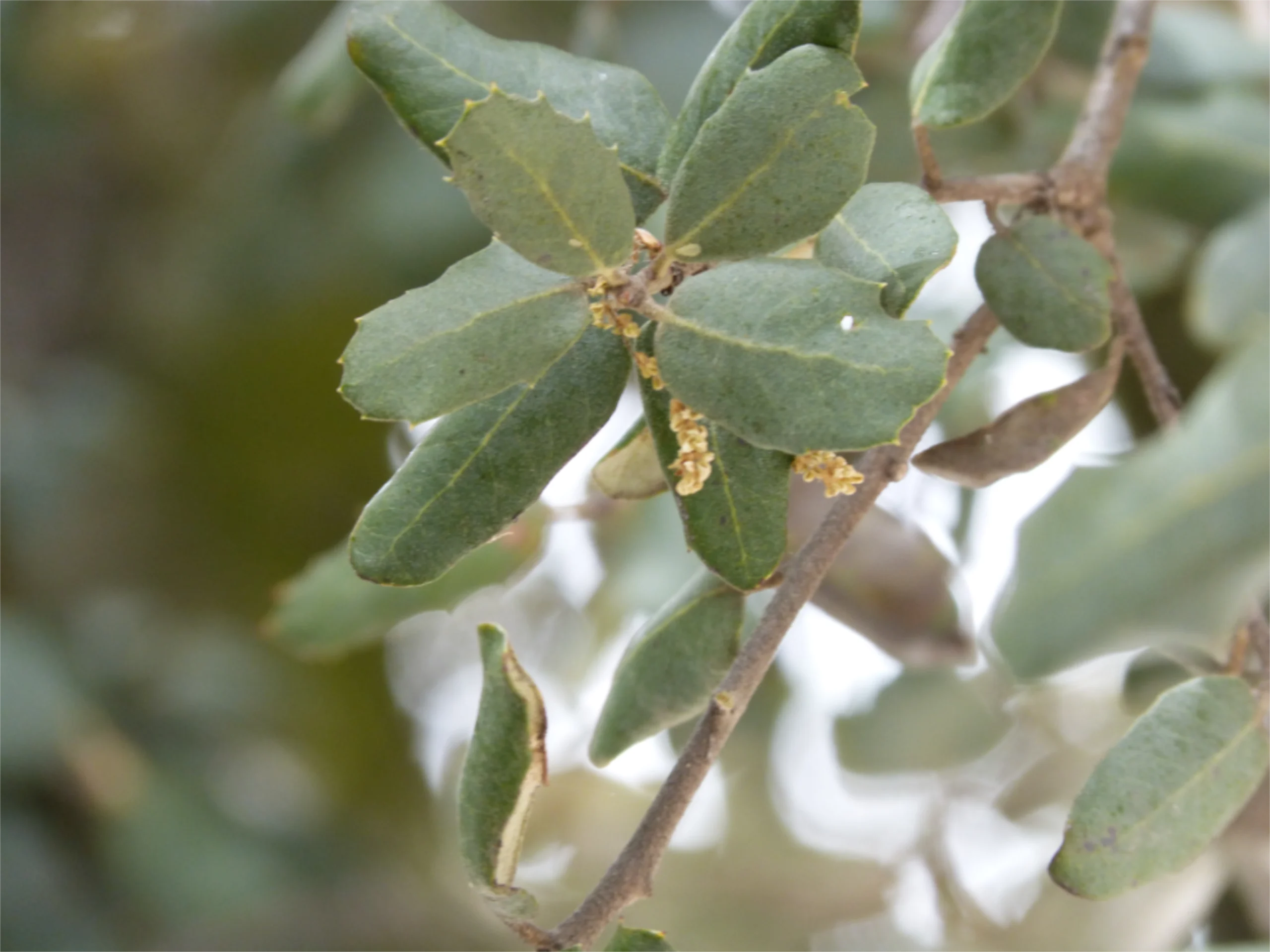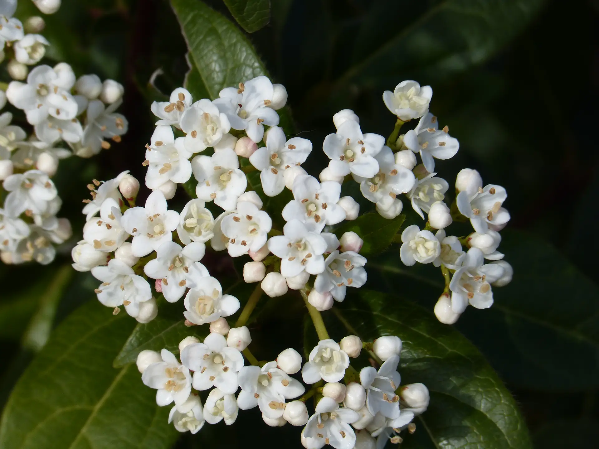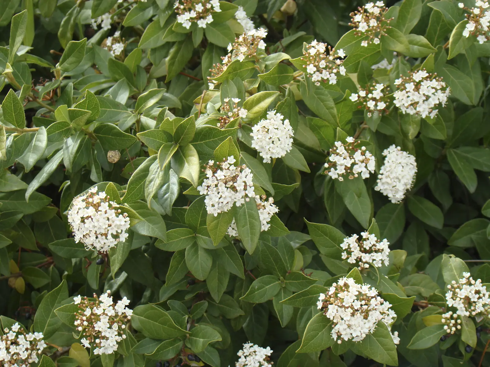 Arbusto perennifolio con hojas simples, opuestas, un peciolo corto y el haz coriáceo de color de color verde oscuro y más claro en el envés. Las flores blancas se disponen en cimas corimbiformes y planas. El fruto es una drupa de color azul metálico , casi negro, con poca carne y un solo hueso.
