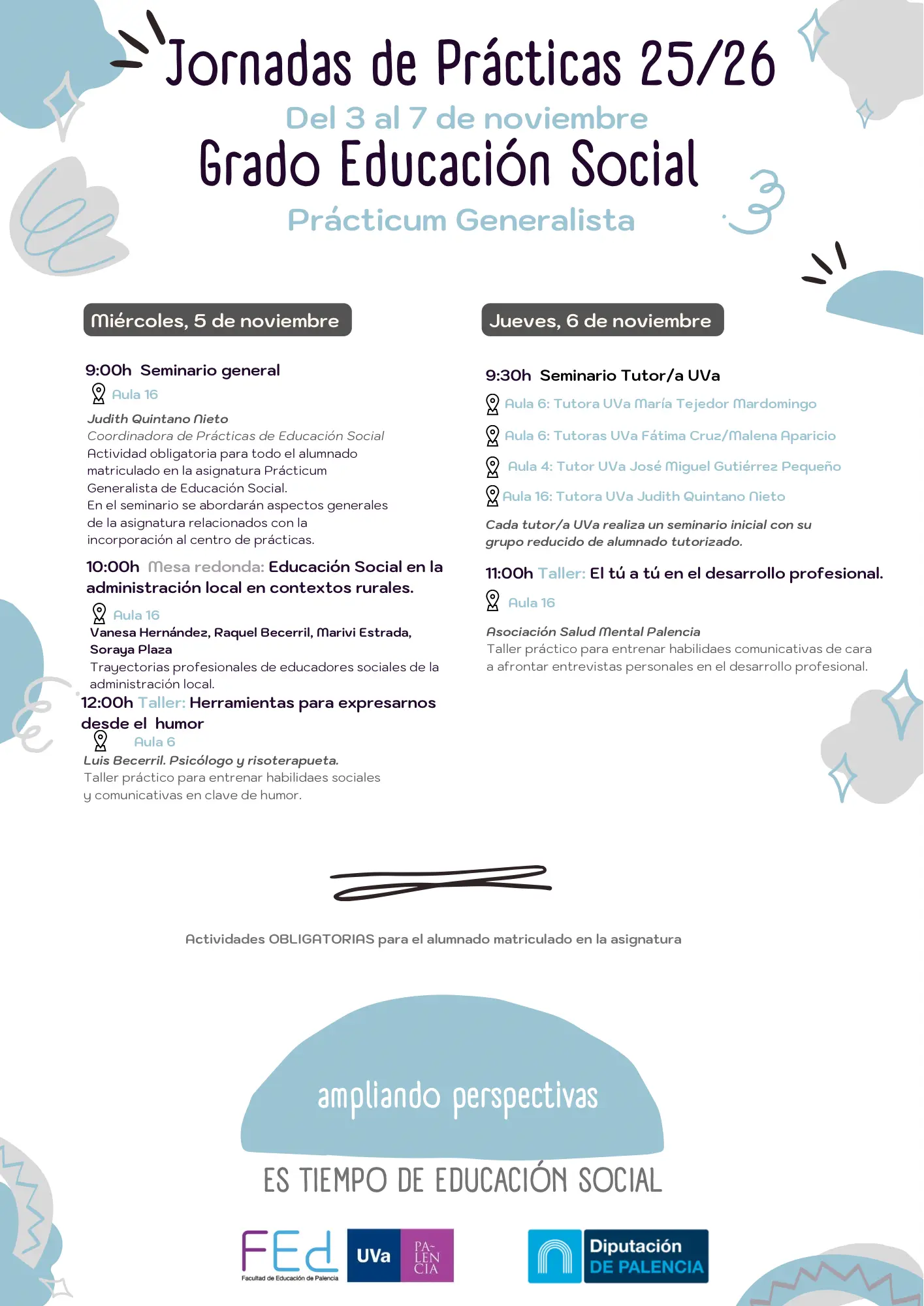 Durante el 5 y 6 de noviembre se desarrollan en la Facultad de Educación de Palencia las “Jornadas de Prácticas” del Grado de Educación Social. Además de los seminarios previos impartidos por profesorado UVa , el alumnado ha compartido una mesa redonda con cuatro educadoras sociales de distintas localidades de la provincia de Palencia. Han relatado su experiencia y trayectoria profesional vinculada a la administración local hasta conseguir estabilizar su situación laboral y convertirse en funcionarias. Su testimonio evidencia el trabajo de los educadores y educadoras sociales en la dinamización comunitaria de los contextos rurales.