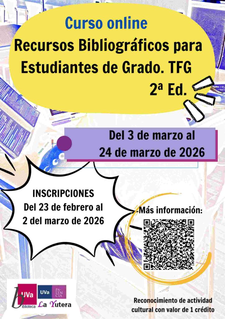 La Biblioteca del Campus de la Universidad de Valladolid en Palencia organiza, del 3 al 24 de marzo de 2026, la segunda edición del ‘Curso online de recursos bibliográficos para estudiantes de Grado. TFG (Agrarias, Ciencias del Trabajo, Educación y Enfermería)’, con reconocimiento académico de 1 crédito como actividad cultural.